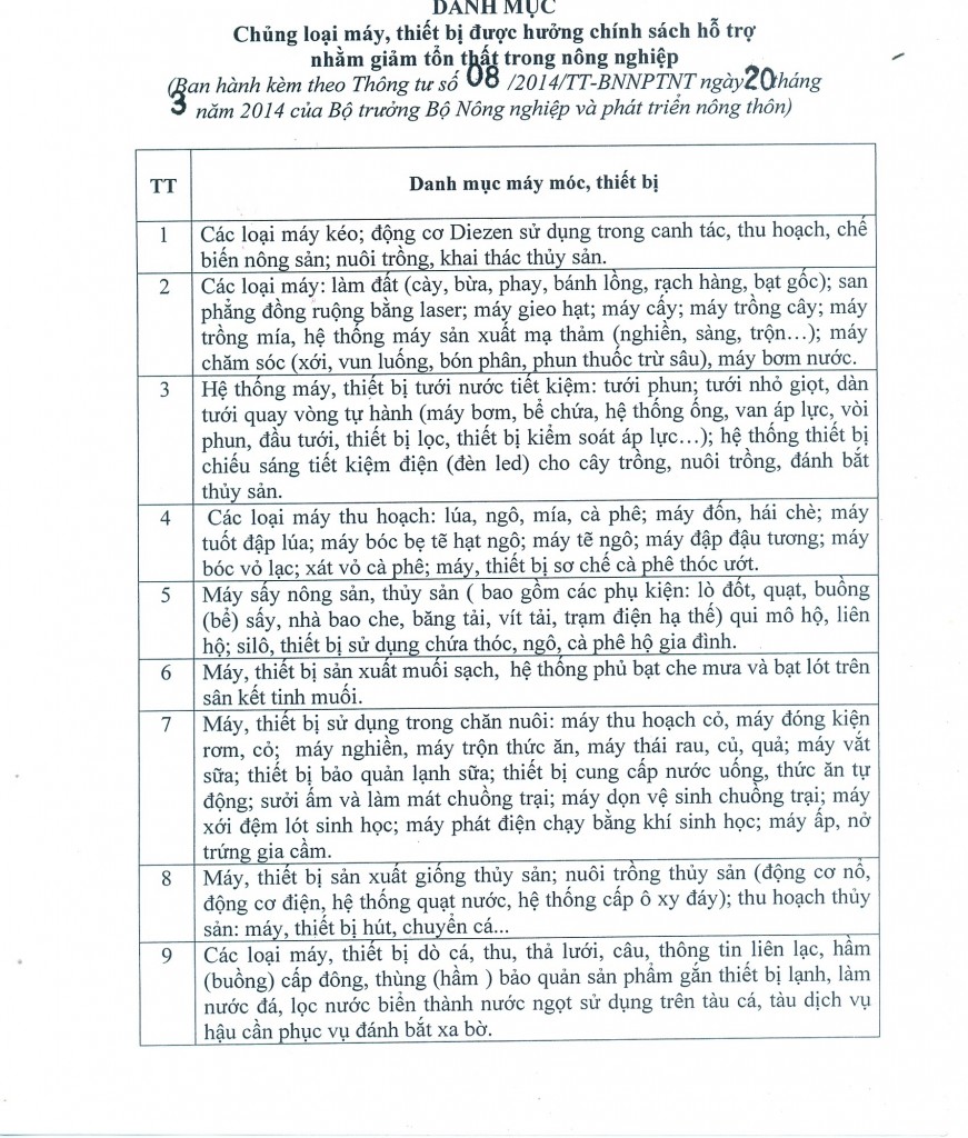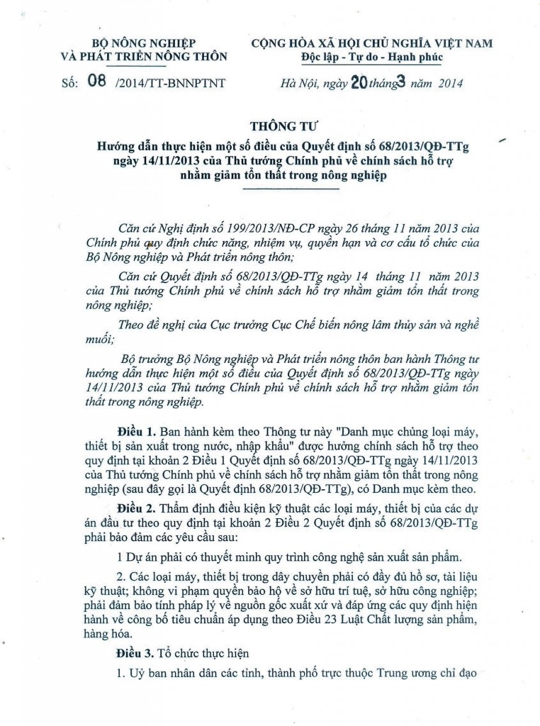 Ngày 20 tháng 3 năm 2014 Bộ Nông nghiệp và Phát triển nông thôn ban hành Thông tư số 08/2014/TT-BNNPTNT hướng dẫn thực hiện một số điều của Quyết định số 68/2013/QĐ-TTg ngày 14/11/2013 của Thủ tướng Chính phủ về chính sách hỗ trợ nhằm giảm tổn thất trong nông nghiệp.